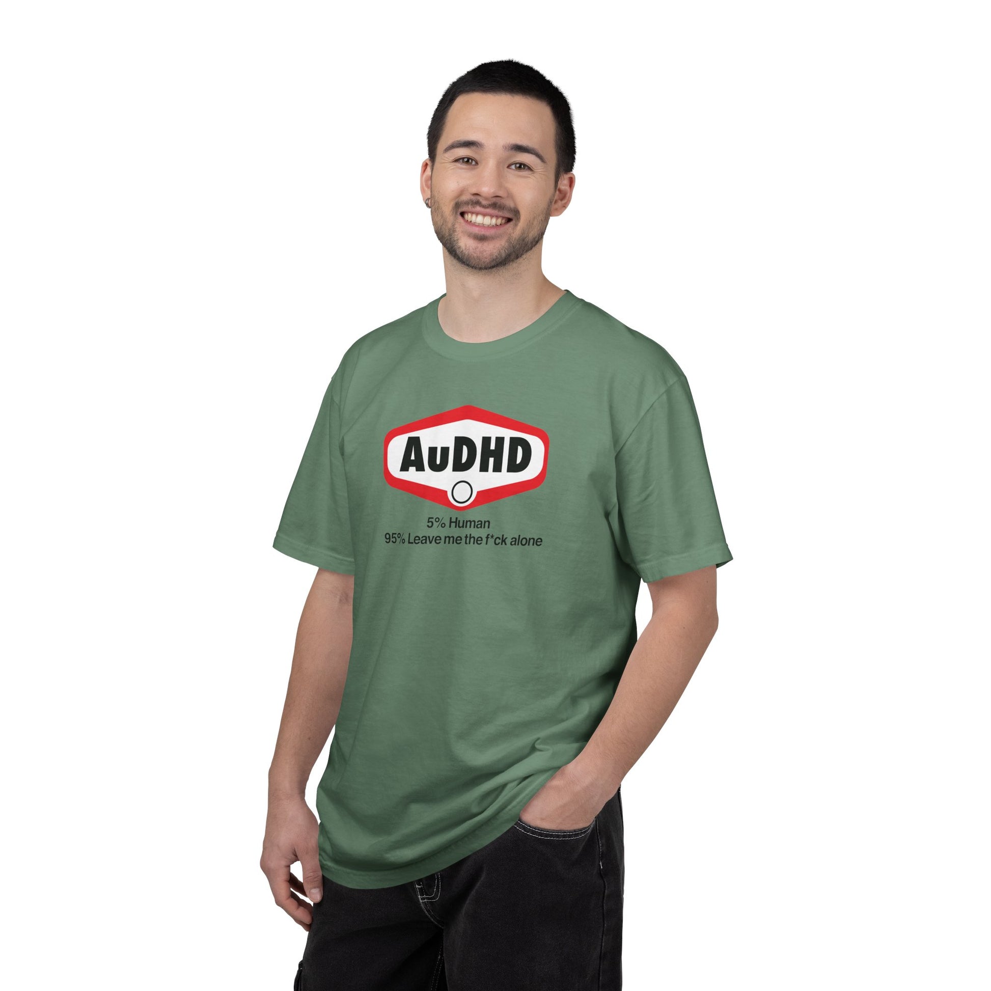 A soft, garment-dyed tee that speaks with quiet humor and honest shorthand. This heavyweight cotton shirt settles in like a favorite hoodie — substantial, slightly lived-in, and comfortable — while the minimalist front graphic calls out a specific neurodivergent identity with blunt warmth. Wear it when you need to cue boundaries without saying too much, or when you want a familiar layer for low-key days, meetups with close friends, or neurodiversity gatherings. The relaxed cut and pre-shrunk ring-spun cotton give it a grounded feel that stays true wash after wash. Subtle distress in the dye and the sewn-in label keep the look authentic and effortless, so it blends easily into a capsule wardrobe focused on comfort and honest expression.